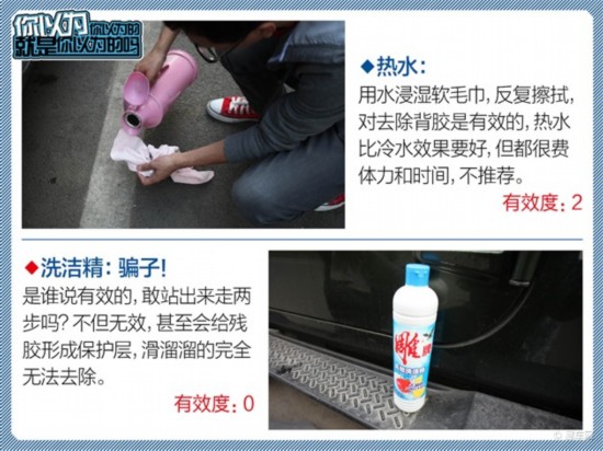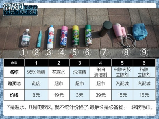 小编先做功课,在网络如此发达的时代,任何问题都会有网络达人争相帮忙,总结下来可能靠谱的建议有:热水、酒精、洗洁精、花露水、电吹风、柏油去除剂、不干胶去除剂……我们来挨个试验。