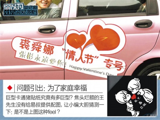 隐去名字的王先生向@易车网发来求助:前女友贴在车门上的巨型卡通猪,被他现女友勒令限期清除——这明显是个保证家庭和睦的大工程,如何能事半功倍?