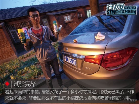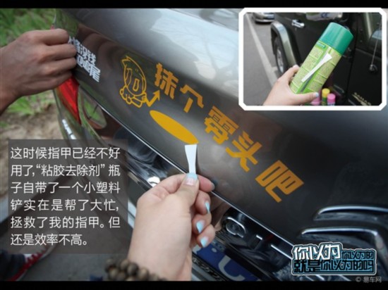 我们的试验需要给车贴更多的时间充分氧化。仔细分析去除车贴的过程,包含两个部分:如何撕下车贴,和如何去除车身上残留的黑乎乎的背胶。为了不给组织留下怠工的印象,我贡献出了自己的车子先来试验“去除车身残留背胶”的方法。