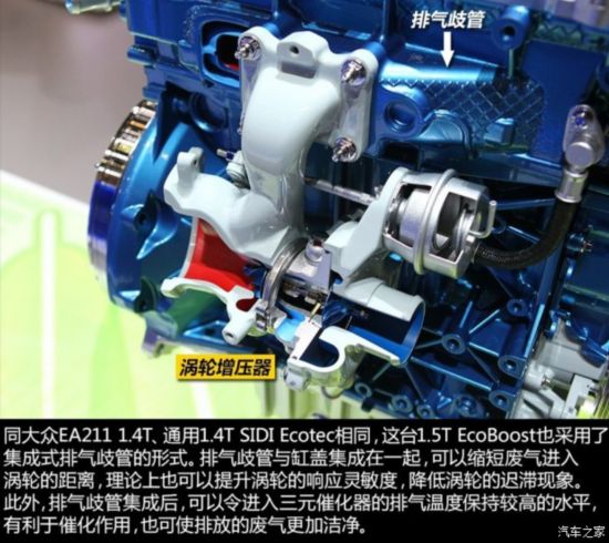 另外,这台1.5T EcoBoost和大众的EA211 1.4T发动机一样,都采用了缸盖集成排气歧管的形式。这种设计不仅能够缩短废气进入涡轮的距离,而且它可以在冷车启动时尽快提升排气温度,令三元催化器的催化效果更好,从而使排放更加环保。其中,1.5T EcoBoost还是福特首个在皮带传动泵上整合了电脑控制离合器的发动机。该技术可进一步提高发动机的工作效率并缩短预热时间。