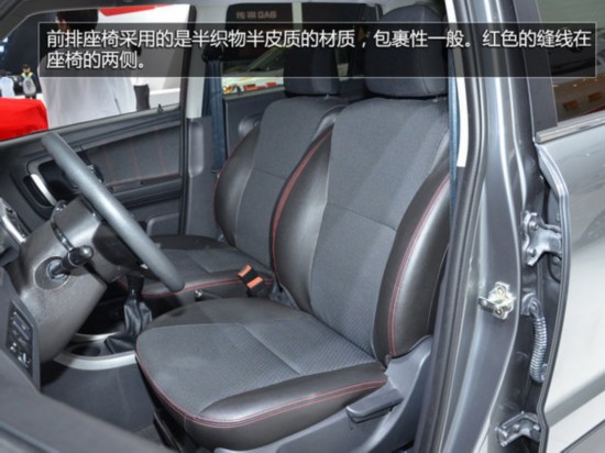 座椅采用的是半织物半皮质的拼接设计,在成本有限的情况下还是尽量照顾了乘车人的感受。红色缝线的运用十分讨巧,让整个单调则座椅变得活跃不少。而得益于整车方正的造型,车内成员的空间也很宽敞,完全没有小型车的压抑感。