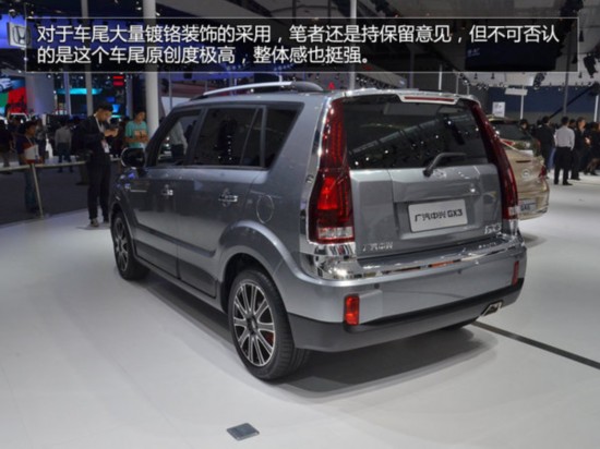 不可否认的是,GX3绝对是广汽中兴近些年来设计的最前卫时尚的产品。虽然可能个别部位还有一丝的不够协调,但总的来说还是相当不错的产品。硬朗的整体造型显得很阳刚,与长城M2有着异曲同工之妙。