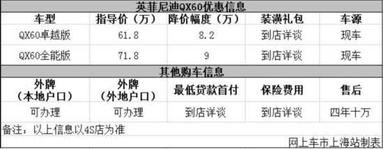日前从上海英菲尼迪了解到,目前该店QX60车型优惠出售,具体信息见下表: