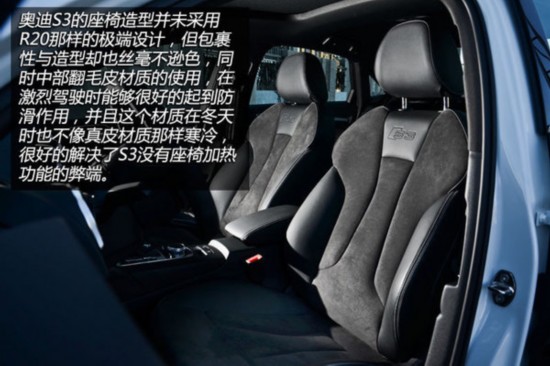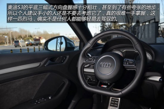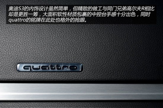 多余的功能只会让爱好性能的驾驶者觉得鸡肋,把有限的成本全部运用在营造运动感上才是他们真正所需要的,让人欣喜的是奥迪S3做到了这一点,原本A3所秉承的简洁动感的设计在S3的身上再一次得到了升华,而在这其中功不可没的就是黑色顶棚的设计了,在我看来,这才是运动型车该有的样子。除此之外,奥迪S3的内饰设计虽然简单,但精致的做工与同门兄弟高尔夫R相比却是更胜一筹,同时quattro的铭牌在此处也格外的抢眼。