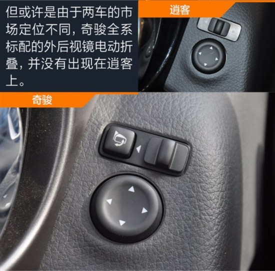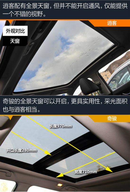 外观小结:作为车系第三高配的逍客2.0L豪华版,虽然比奇骏入门级的舒适版多了车顶行李架、L型LED雾灯、透镜大灯以及更大的18寸轮圈,在视觉效果上更优。但是低配奇骏在配置上并不落后,全景监控、LED日间行车灯、无钥匙进入一样不少,还多了外后视镜电动折叠功能,全景天窗还可开启,无疑更加实用。
