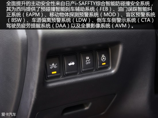 除此之外,新一代西玛的安全系统也得到了全面升级,来自日产的i-SAFFTY综合智能防碰撞安全系统配备有预碰撞智能刹车辅助系统(FEB)、油门误踩智能纠正系统(EAPM)、移动物体探测预警系统(MOD)、盲区预警系统(BSW)、车道偏离预警系统(LDW)、倒车车侧警示系统(CTA)、驾驶员疲劳提醒系统(DAA)以及全景影像系统(AVM)。