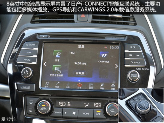 与此同时,传统的中控液晶屏幕仍被赋予了较全面的功能性。8英寸的彩色触控屏幕可提供包括日产i-CONNECT智能互联系统,多媒体播放、GPS导航和CARWINGS 2.0车载信息服务系统等多样且智能化的功能体验。