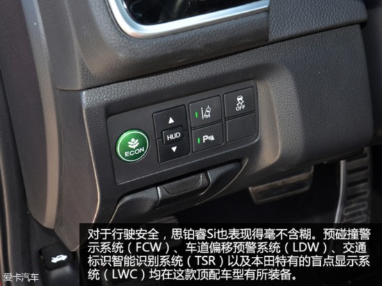 此外,思铂睿Si所装备的预碰撞警示系统(FCW)、车道偏移预警系统(LDW)、交通标识智能识别系统(TSR)以及本田特有的盲点显示系统(LWC)也为驾驶者提供了完善的驾驶安全辅助。