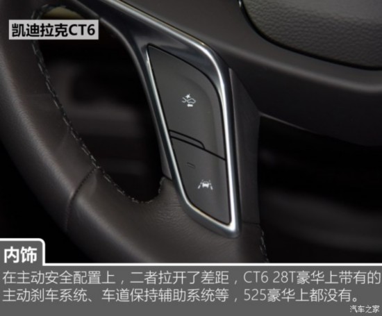 宝马5系的方向盘样式的确是有点老了,而这还已经是“运动方向盘”了,再看CT6,虽然采用了4辐方向盘,但看上去并不是那么老气,而且在上面我们看到了换挡拨片和一些主动安全配置的按键,这些配置在525豪华上都是没有的。