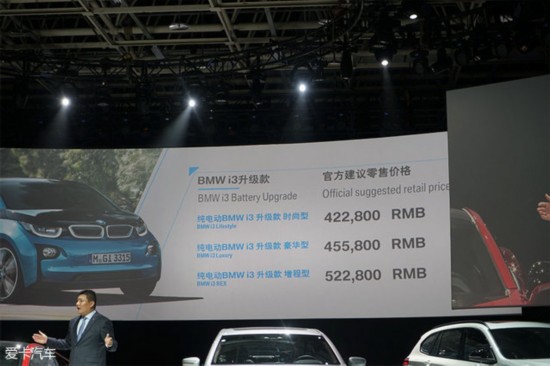 在2016年成都车展前夕,宝马i3升级版车型在国内正式上市。新款电动版i3的锂电池容量进行升级,达到33kWh。根据不同配置,新车共推出3款车型,售价区间为42.28-52.28万。