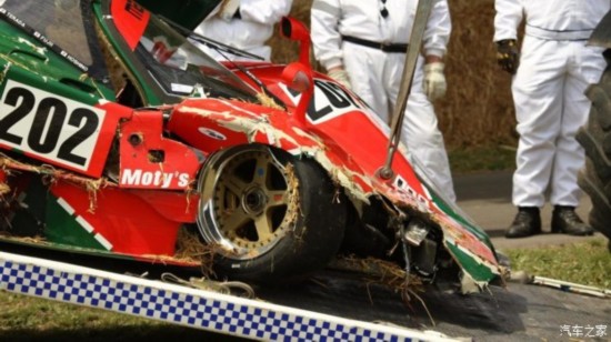 比起今年的赛车,2015年古德伍德速度节上撞的这台更有来头,它就是勒芒冠军车型马自达787B,当时它在出弯后狠狠地撞向了路边缓冲草垛,右前方和后扰流板受损严重。