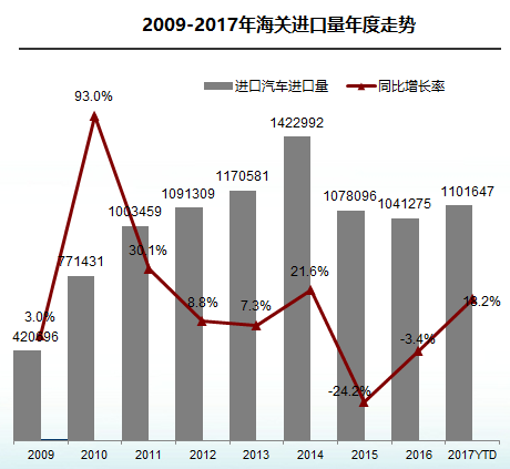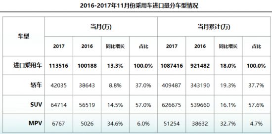 2017年11月,中国汽车进口量为11.5万辆,同比增长12.8%。王存表示,随着进口车供需达到平衡状态,回补库存的趋势基本结束。目前,进口量与消费者需求基本实现平稳增长。