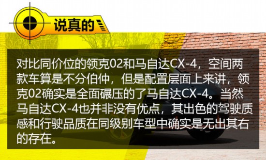 答案其实显而易见了,如果您喜欢丰富的配置,喜欢享受生活,那么领克02绝对是一个不错的选择,而1.5T发动机也足够日常使用了。当然了,您要是对驾驶有偏好,不喜欢每天平淡而枯燥的从A点到B点,那么马自达CX-4绝对是不二之选。(汪一舟)