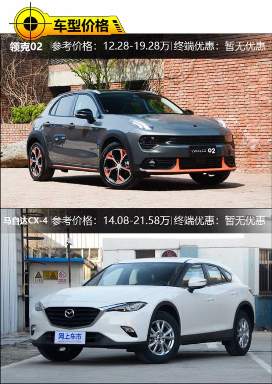 领克02刚刚上市,自然不会有优惠,而马自达CX-4的热销也让它几乎没有任何让利,所以我们挑选售价同为15.28万元的领克02 1.5T 两驱劲Pro版和马自达CX-4 2.0L自动两驱蓝天活力版来进行对比。
